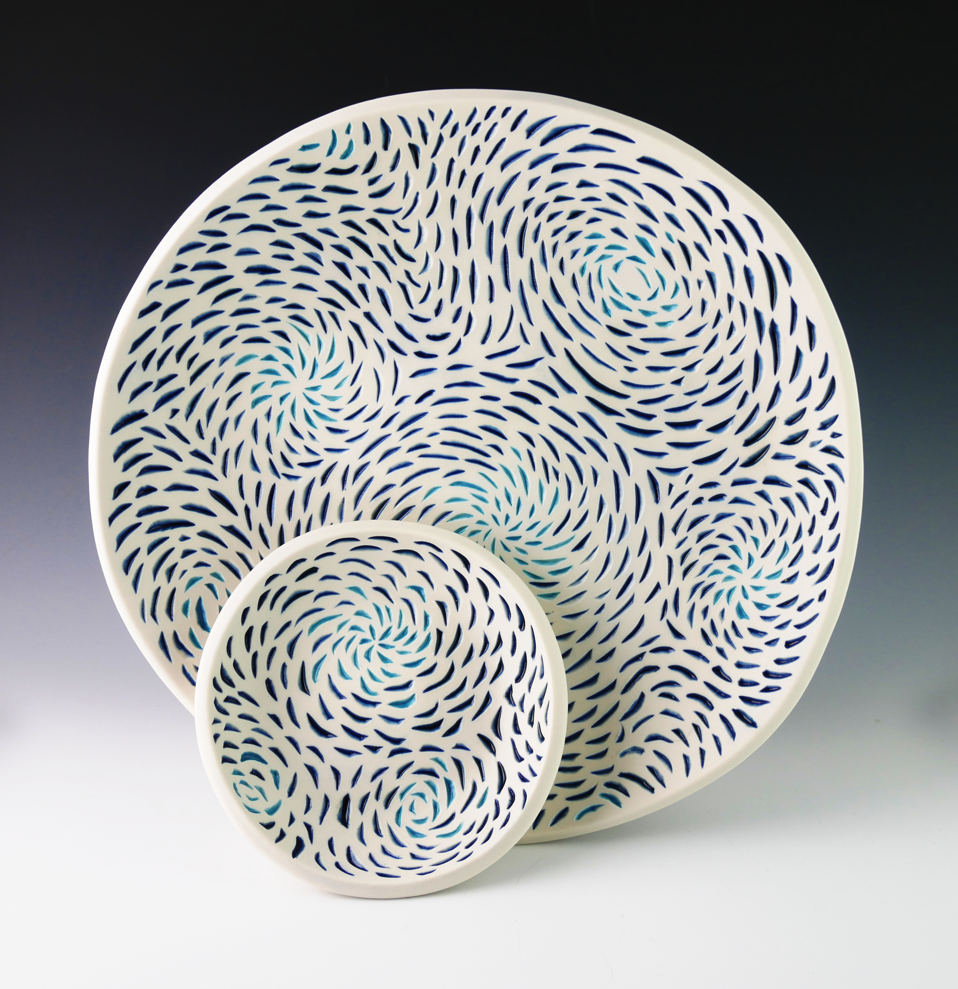 Porcelain; handbuilt and handcarved12" w/d x 2"h