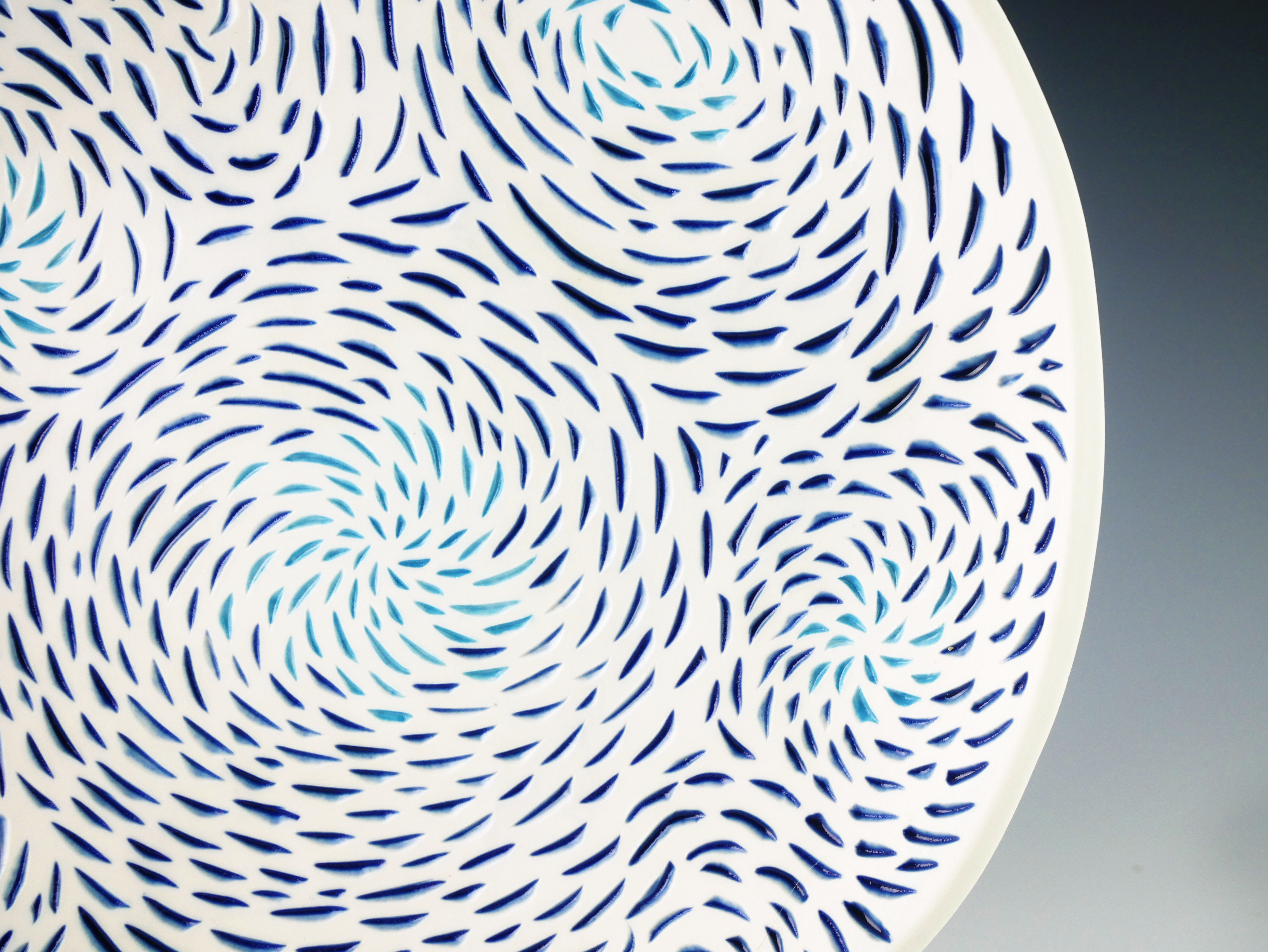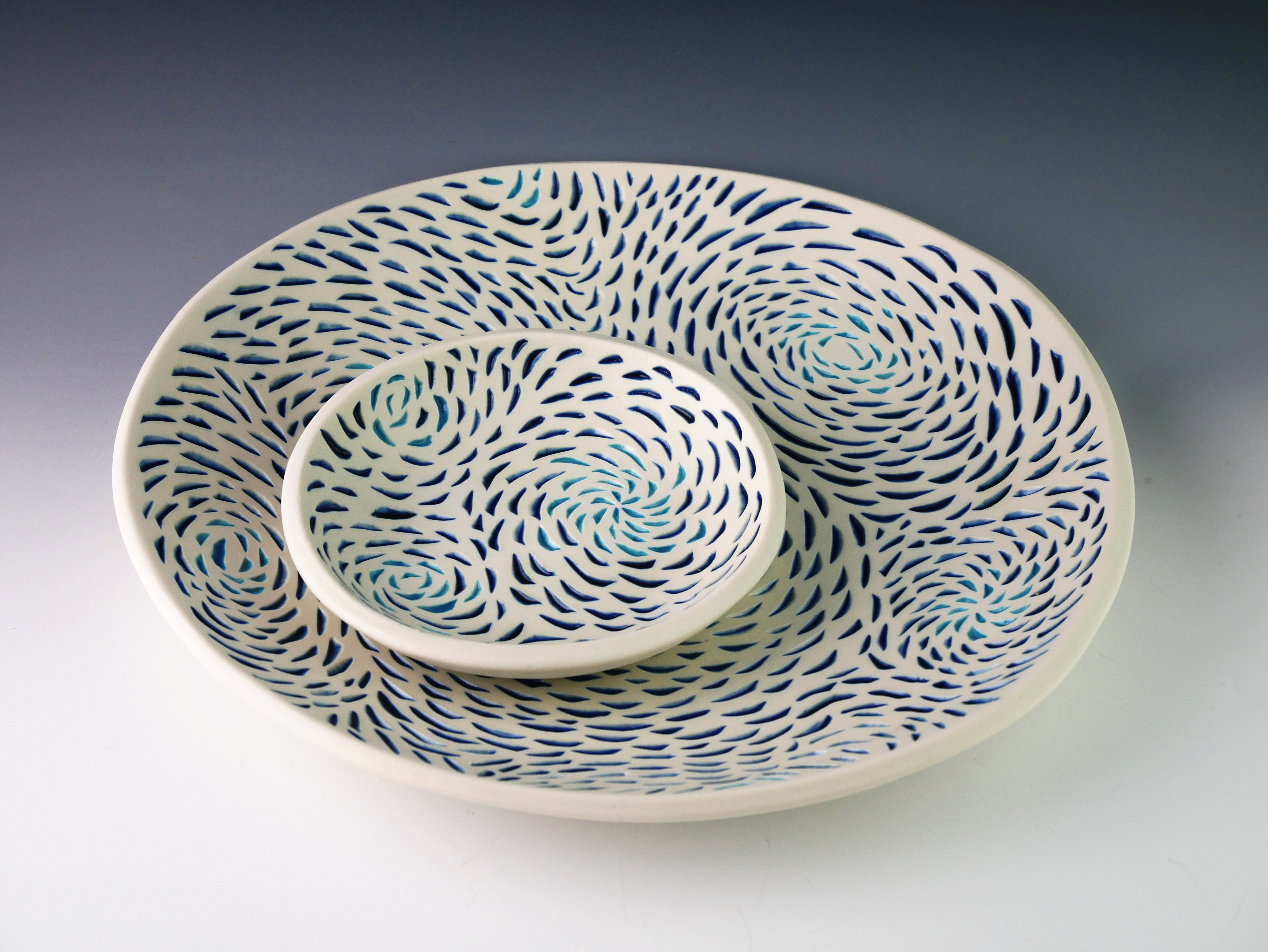 Porcelain; handbuilt and handcarved12" w/d x 2"h